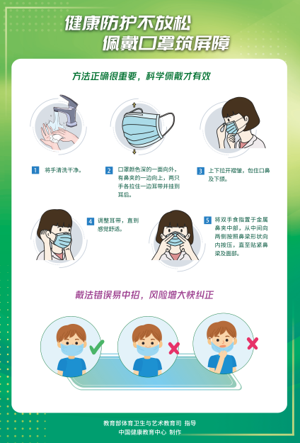该系列挂图共7张,主要依据《高等学校、中小学校和托幼机构新冠肺炎疫情防控技术方案(第五版)》等相关权威信息,聚焦在校期间应如何做好个人健康防护,尤其是戴口罩、手卫生、常通风等重点内容,通过生动形象的图示、朗朗上口的文字,以图文并茂的方式,为师生员工普及相关健康知识和技能,提出遵守疫情防控人人有责的要求,倡导每个人都是自身健康的第一责任人理念。