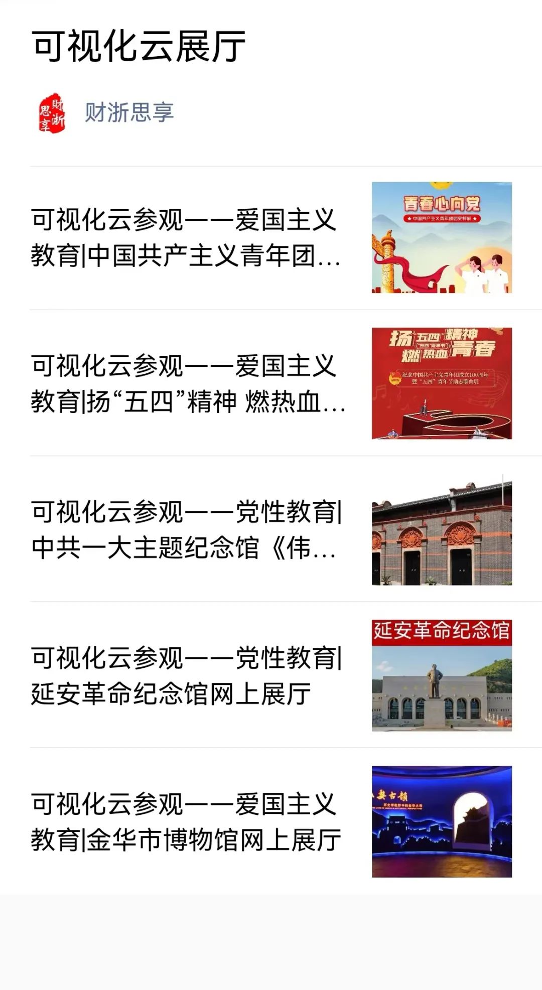二是广泛收集红色教育、博物馆、爱国主义基地、廉政基地相关的云展厅,并在“财浙思享”微信公众号开设“可视化云展厅”品牌专栏。马克思主义学院思政教师积极利用“可视化云展厅”资源开展数字化辅助教学,取得了良好成效。