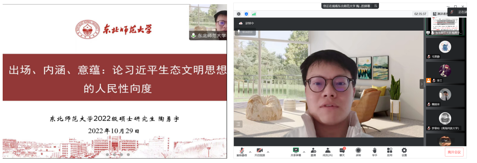 东北师范大学马克思主义学院的陶勇宇作了题为《出场、内涵、意蕴:论习近平生态文明思想的人民性向度》的主题报告。他指出人民性是习近平生态文明思想的核心要义,充分阐述了“人民性”这一概念的生成、逻辑、价值,并提出需从出场、内涵、意蕴三个层面去把握。