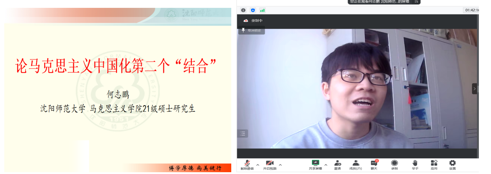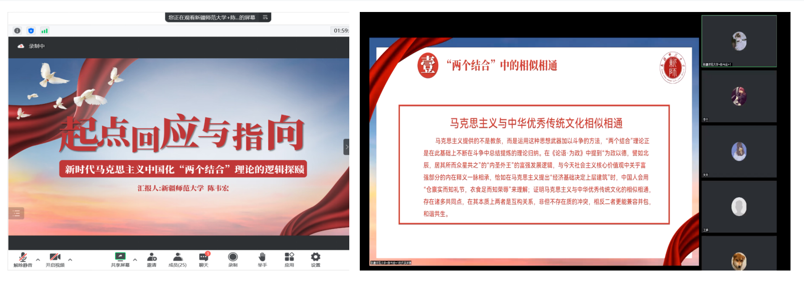 新疆师范大学马克思主义学院陈韦宏作了题为《起点、回应与指向:新时代马克思主义中国化“两个结合”理论的逻辑探赜》的主题报告。他结合自己的学术背景,指出马克思主义在当代发扬了更加鲜明的实践特性,马克思主义与中华优秀传统文化相结合,诞生了“两个结合”理论,形成了自己独特的见解。