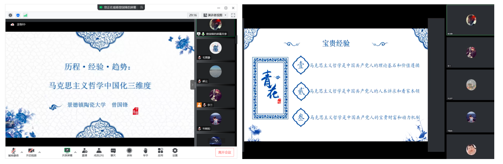 景德镇陶瓷大学曾国锋作了题为《历程·经验·趋势:马克思主义哲学中国化三维度》的主题报告。他介绍了马克思主义哲学中国化的发展历程,分享了其中一些宝贵经验,最后阐述了它未来的发展趋势,强调马克思主义哲学对中国自主的哲学体系的建立尤为重要。