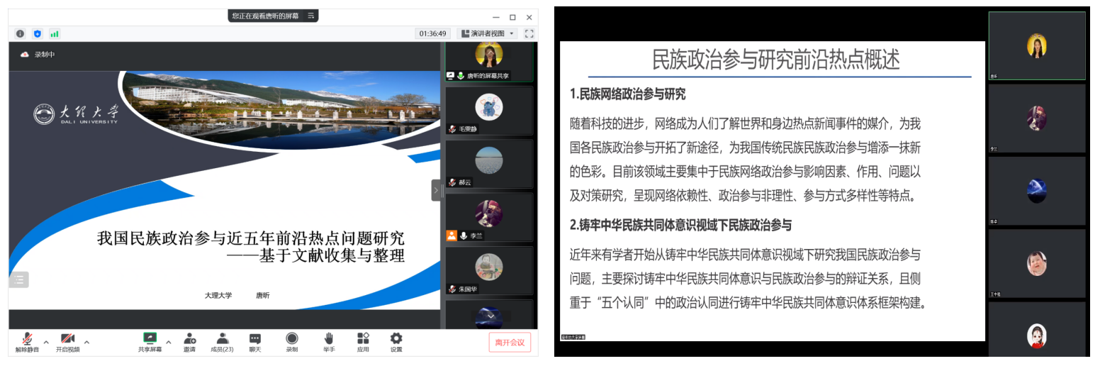大理大学马克思主义学院唐昕作了题为《我国民族政治参与近五年前沿热点问题研究——基于文献收集与整理》的主题报告。她以民族政治的参与作为切入点,概述了民族政治参与研究的前沿热点,提出了民主政治参与研究的一些方法、内容,展望了这一课题研究的未来前景和期待。