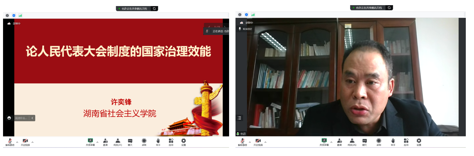 湖南省社会主义学院许奕锋教授作了题为《论人民代表大会制度的国家治理效能》的主旨报告。许教授从筑基、协商、规范、整合、保障和监督等六个方面对人民代表大会制度的国家治理效能做了分析,提出要通过增强这六个方面的效能以更好发挥人民代表大会在国家治理实践中的独特优势和重要作用。