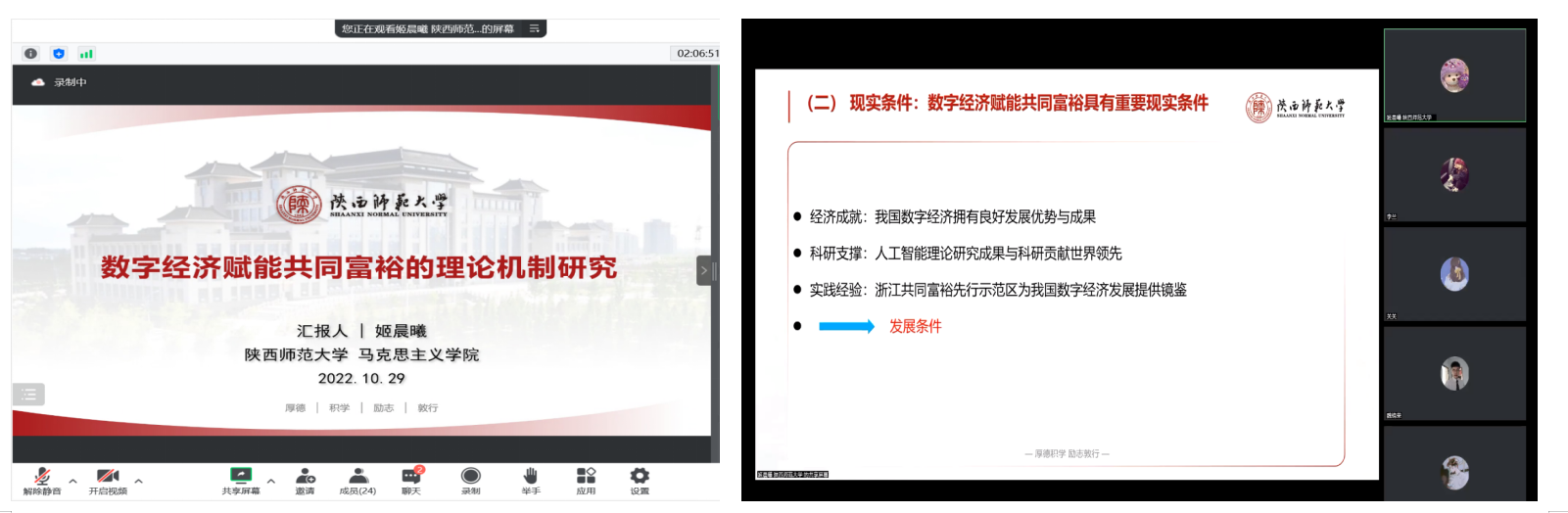 陕西师范大学马克思主义学院姬晨曦作了题为《数字经济赋能共同富裕的理论机制研究》的主题报告。她认为共同富裕是现代化建设的重要目标,数字经济推动了社会主义现代化建设的历程,契合了共同富裕的时代发展要求,为实现物质生活富裕提供了源源不断的精神动力。