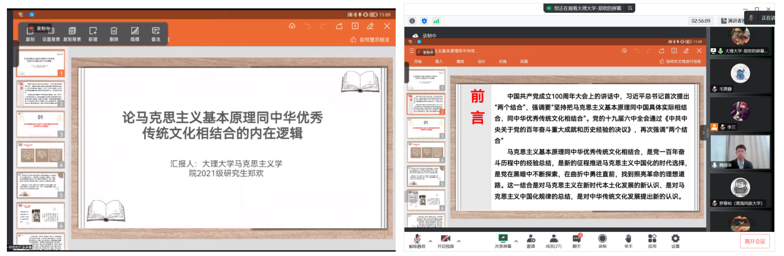 大理大学郑欢作了题为《论马克思主义基本原理同中华优秀传统文化相结合的内在逻辑》的主题报告。她认为,马克思主义基本原理同中华优秀传统文化相结合对于新时代在实践中进一步推进乡村振兴和区域协调发展,对于提升共建“一带一路”倡议和构建人类命运共同体具有广泛影响,对实现第二个一百年奋斗目标具有重要意义。