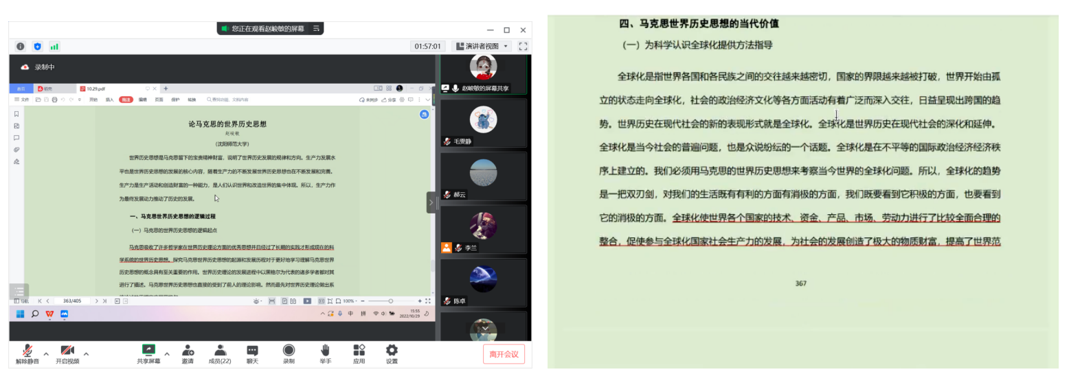 沈阳师范大学赵峻敏作了题为《论马克思的世界历史思想》的主题报告。她从马克思历史思想的逻辑过程出发论述了这一思想的逻辑起点和逻辑体系,紧接着从马克思历史思想的基本内容方面介绍了建立世界范围内的共产主义形态是世界历史发展的最终目标。她还详细介绍了马克思世界历史思想的基本特征,提出了马克思世界历史思想的当代价值之所在。