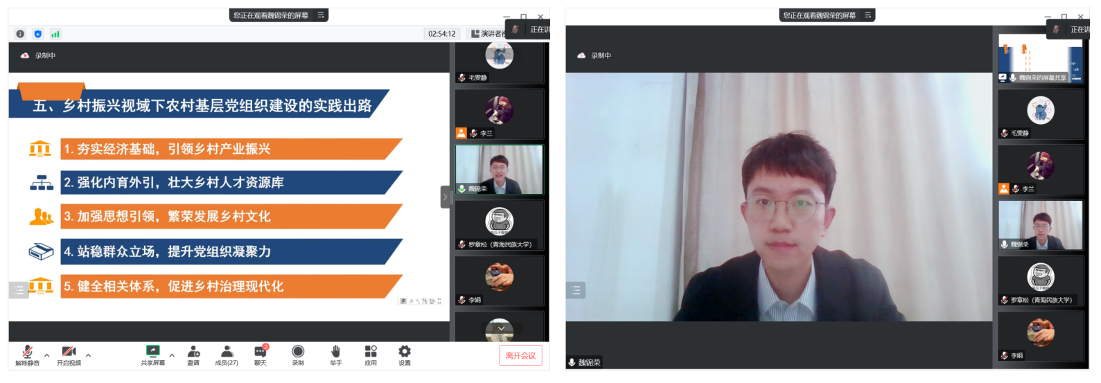 四川商务职业学院思政课教师魏锦荣作了题为《乡村振兴视域下农村基层党组织建设的功能定位、现实困境与实践出路》的主题报告。他以乡村振兴为背景,提出农村基层党组织建设需要坚持内育外引、思想引领以及站稳群众立场的原则。