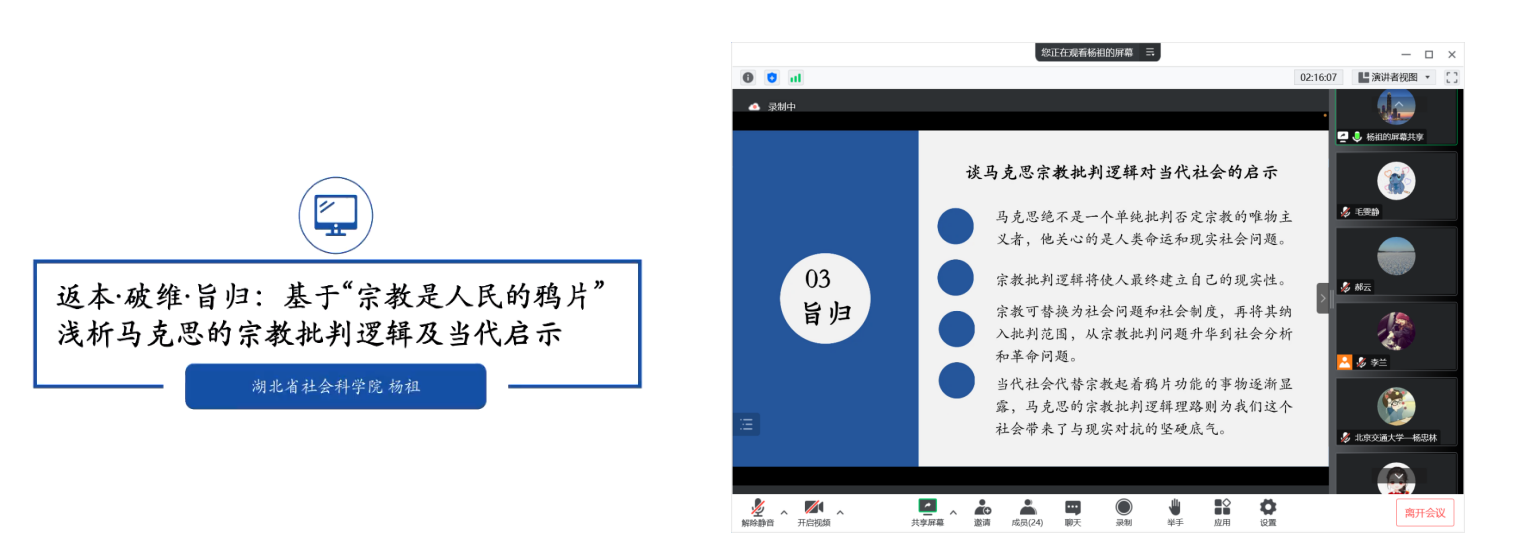 湖北省社会科学院杨祖作了题为《马克思的宗教批判逻辑及当代启示》的主题报告,通过对“鸦片论”的阐述,揭示了马克思主义对宗教的批判性思维和价值所在,提出了马克思宗教批判逻辑对当代社会的启示。