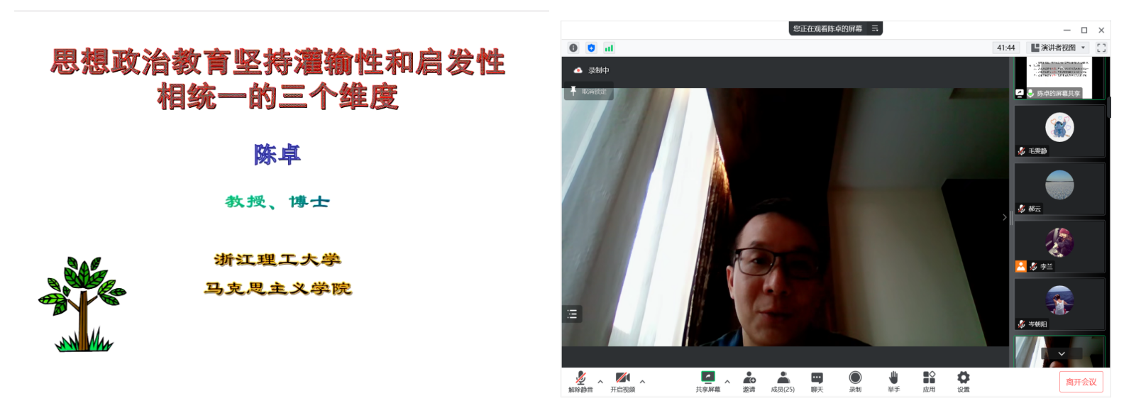 浙江理工大学马克思主义学院教授陈卓作了题为《思想政治教育坚持灌输性和启发性相统一的三个维度》的主旨报告。他提出,从教育本质、教育内容和教育方法等三个维度上来看,思想政治教育可以概括为:品德塑造和品德养成相统一、共同价值和多元价值相统一、理论教育和实践教育相统一。三个相统一为思想政治教育坚持灌输性和启发性提供了逻辑依据。