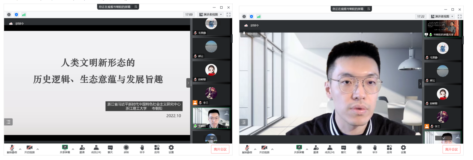 浙江省习近平新时代中国特色社会主义思想研究中心、浙江理工大学马克思主义学院岑朝阳作了题为《人类文明新形态的历史逻辑、生态意蕴与发展旨趣》的主题报告。他介绍了建设与发展生态文明的重要性,从物质文明、政治文明、精神文明和社会文明四个方面展现了人类文明新形态的多维构成与生态意蕴,提出了人类文明新形态中生态文明建设的全球视野与发展旨趣。