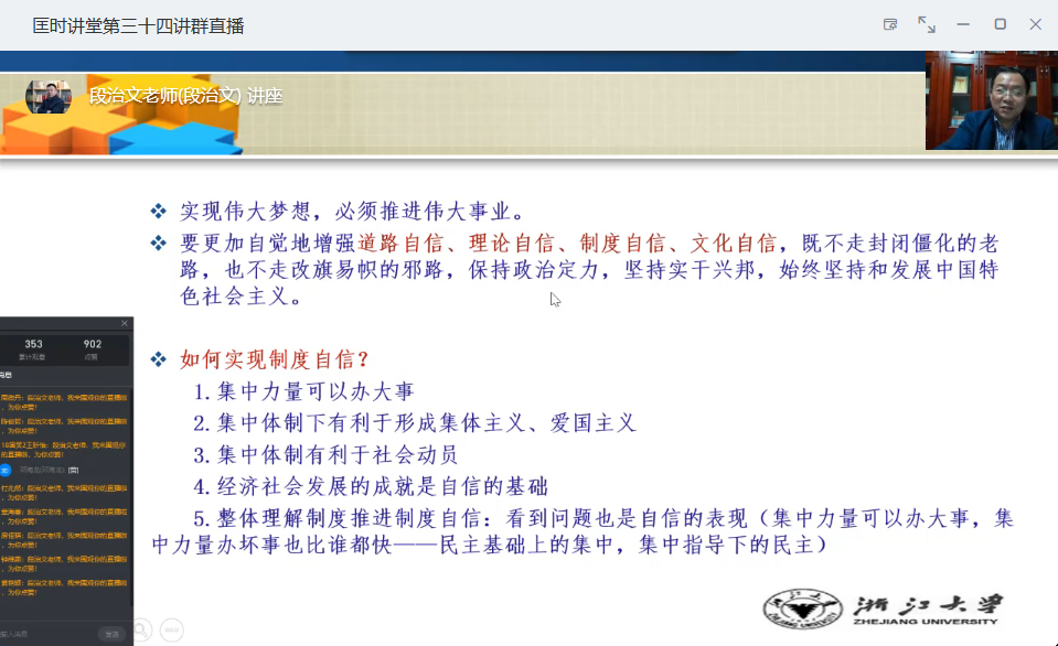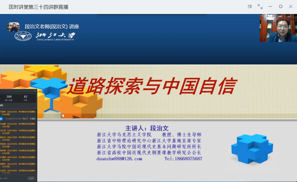 4月23日下午,公共基础部思想政治理论课教学与科研部在钉钉云端通过直播的方式开展了匡时讲堂第三十四讲。本次匡时讲堂我们有幸邀请到了浙江大学马克思主义学院博士生导师段治文教授,段教授讲座的题目是“道路探索与中国自信”。讲座由李宛荫老师主持,学院师生350余人参加。