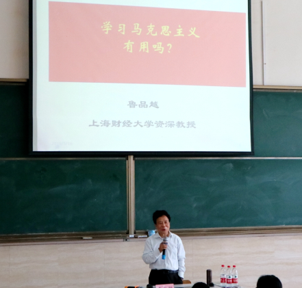 鲁教授讲座主要是与同学们探讨学习马克思主义的意义。他从中华民族传统的实用精神谈起,谈到这种实用精神在市场经济条件下的一些歪曲表现,比如拜金主义、明星崇拜甚至是中国少年的娘化现象。接着,鲁教授指出,这种状况必须改变!中华优秀传统必须按新时代需要来继承!这个新时代的新精神,正是中国共产党领导中国人民创造了今天中国的精神武器——马克思主义。马克思主义是什么呢?鲁教授用他独特的视角解读了马克思主义,强调马克思主义是宝贵的人生精神食粮,学习马克思主义有利于确立全社会正确的价值导向,有利于大家用人民根本利益确立个人发展方向,有利于透视社会现象本质,有利于理解历史发展规律,还有利于提升精神境界。