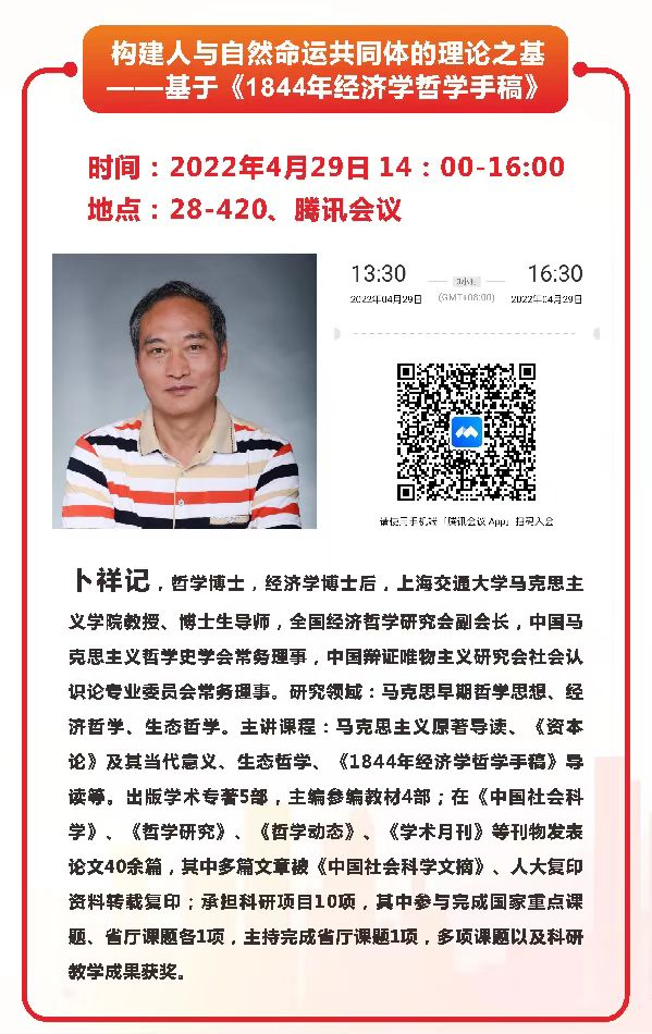4月29日,马克思主义学院利用腾讯会议举行了本学期第四次学术沙龙活动。这次活动邀请了上海交通大学马克思主义学院卜祥记教授做了题为《构建人与自然命运共同体的理论之基——基于<1844年经济学哲学手稿>》的学术报告。项丹婷主持了本次学术沙龙活动。马克思主义学院全体思政教师及部分学生参加了本次活动。