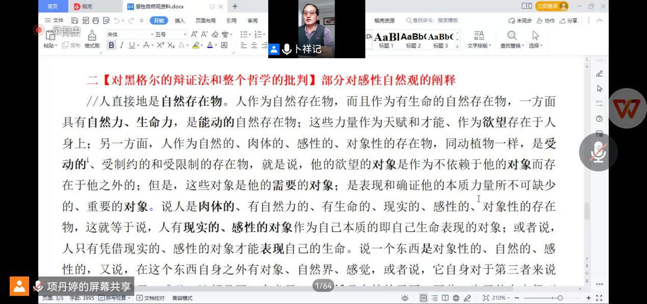 卜教授认为,对象关系与对象性关系有着本质的不同,并就这种不同作了简要的区分。接着,他运用马克思《1844年经济学哲学手稿》中关于共产主义、异化、私有财产的积极扬弃等理论,充分论证了人是怎样在人与人、人与自然的感性的对象性关系中互为本质、互为生命的,论证了人与自然作为生命共同体的新型自然观。