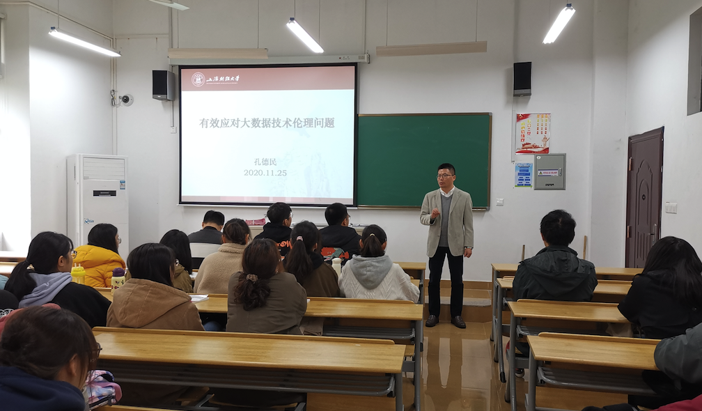 11月25日上午,上海财经大学浙江学院党委副书记孔德民走进2019级学生教室讲授思想政治课,为20数据科学与大数据技术班带来了一堂“有效应对大数据技术伦理问题”的精彩现场示范课。