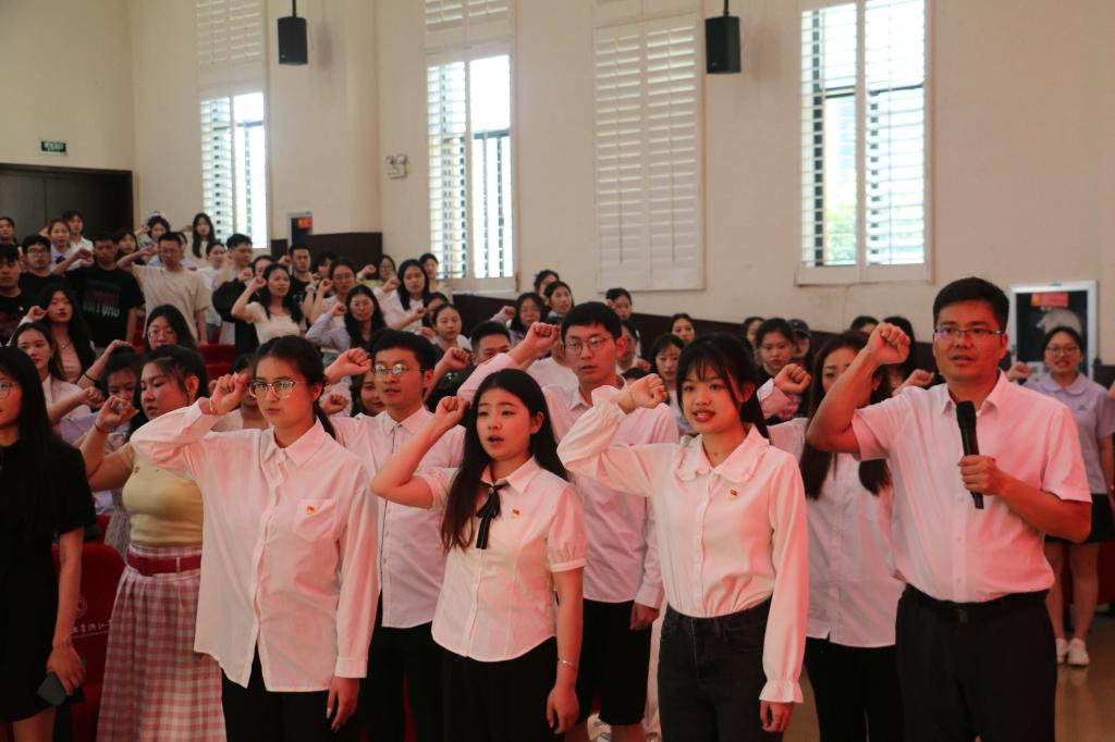 党课最后,何志强带领全体毕业生党员重温入党誓词。与党旗合影留念。毕业生党员面向党旗庄严宣誓,在铮铮誓言中重温入党初心,牢记不渝使命。