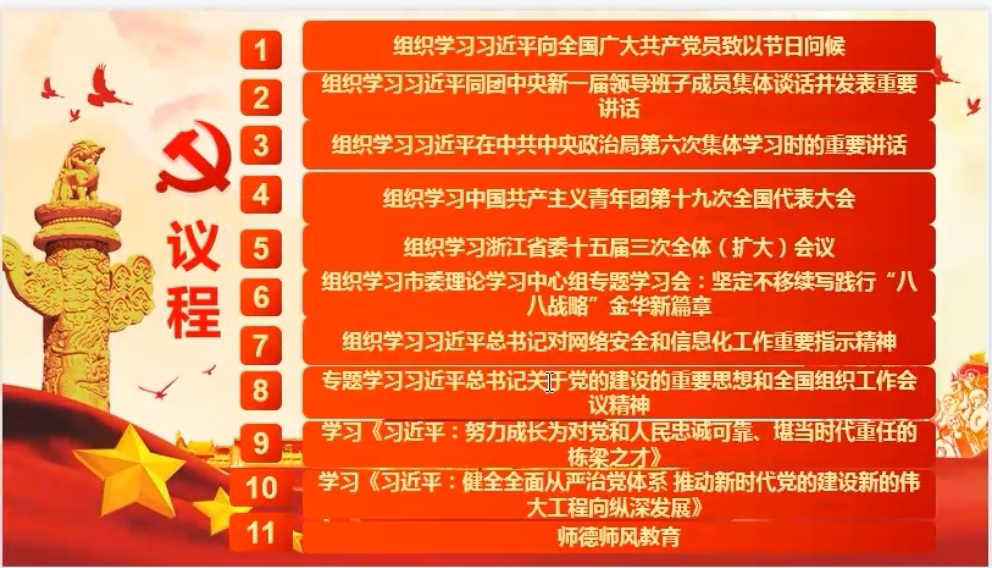随后,支委关春华领学了《习近平同团中央新一届领导班子成员集体谈话并发表重要讲话精神》。支委王科领学了《习近平在中共中央政治局第六次集体学习时的重要讲话精神》、《中国共产主义青年团第十九次全国代表大会会议精神》。支委李宛荫领学了《习近平:努力成长为对党和人民忠诚可靠、堪当时代重任的栋梁之才》、《习近平:健全全面从严治党体系推动新时代党的建设新的伟大工程向纵深发展》。支委王婷领学了《浙江省委十五届三次全体(扩大)会议精神》、《金华市委理论学习中心组专题学习会:坚定不移续写践行“八八战略”金华新篇章》、《习近平总书记对网络安全和信息化工作重要指示精神》。李宛荫就《习近平总书记对网络安全和信息化工作重要指示精神》谈了学习体会。