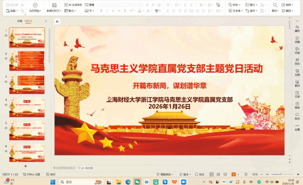 在开场领学环节,支部组织学习了《习近平:学习好贯彻好党的二十届四中全会精神》《中共中央政治局召开民主生活会 习近平主持会议并发表重要讲话》《2026年全国教育工作会议召开》《王浩在浙江省委常委会扩大会议上强调:奋力干出开局之年的新进展新成效》《新年贺词,习近平为何再次提到“窑洞之问 ”?》《攻坚!2026年教育工作的调子,定了!》《透过教改热词,看教育强国建设新图景》《新华社重磅长文丨以习近平同志为核心的党中央2025年治国理政纪实》 《中共中央政治局召开会议 研究部署党风廉政建设和反腐败工作 习近平主持会议》《“掌握意识形态工作的主动权”——习近平总书记在浙江工作期间文化理念与实践·意识形态篇》《以推进国家安全体系和能力现代化护航中国式现代化——深入学习<习近平谈治国理政>第五卷》以及一图读懂2026年金华市政府工作报告要点等文件精神。